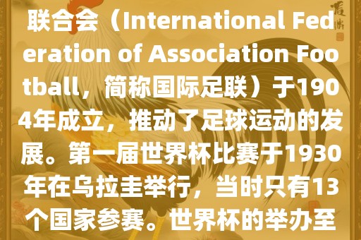 世界杯源自19世纪末的瑞士,随着足球运动的普及,国际足联于1904年成立。第一届世界杯比赛于1930年在乌拉圭举办,仅有13个国家参赛。世界杯历史已近百年,期间国际足联不断推动足球运动发展,并见证了许多重要里程碑和事件。