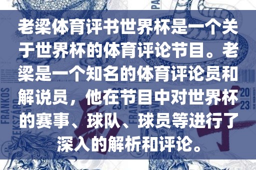 在该节目中,老梁会结合自己的专业知识和独到的见解,对世界杯期间的比赛进行预测和分析,同时还会介绍世界杯的历史背景、文化内涵等相关内容,他的评论风格幽默风趣,富有感染力,能够吸引广大球迷的关注和喜爱。