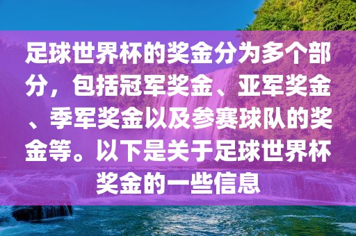 足球世界杯的奖金分为多个部分,包括冠军奖金、亚军奖金、季军奖金以及参赛球队的奖金等。以下是关于足球世界杯奖金的一些信息