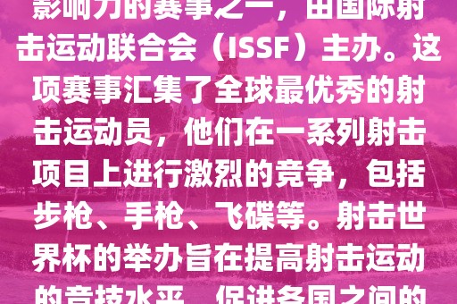 射击世界杯的举办时间和地点每年都有所不同,通常在各大洲的多个国家和地区轮流举办,赛事规模庞大,参赛国家众多,吸引了全球射击爱好者的关注,在比赛中,运动员们需要展示高超的射击技巧、稳定的心理素质和出色的体能,以争夺最终的冠军荣誉。