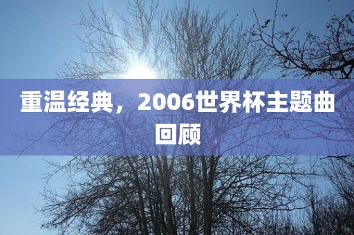 摘要:本文将带您重温经典,回顾2006年世界杯的主题曲。作为足球盛事的标志之一,世界杯主题曲不仅代表着当时的文化和潮流,更是全球球迷的共同回忆。本文将介绍那首令人难以忘怀的主题曲,带您重温那个激情四溢的夏天。