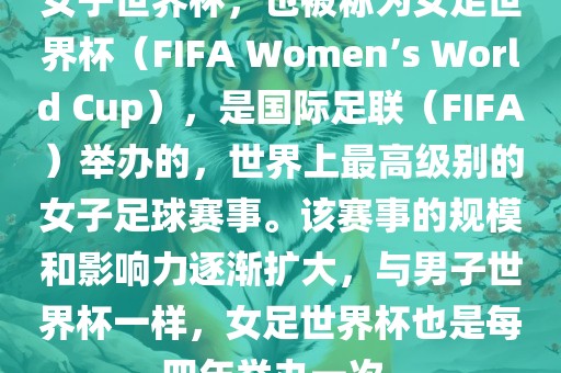 女足世界杯是国际足联举办的女子足球最高级别赛事,每四年举办一次,其规模和影响力逐渐扩大。该赛事旨在促进女子足球运动的发展,并激发全球范围内对女子足球的关注和热情。