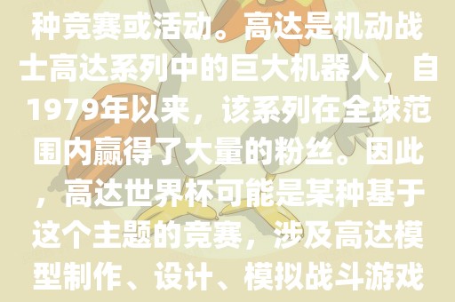 为了获取关于“高达世界杯”更具体的信息,您可以尝试在社交媒体平台上搜索相关话题,或者查看与高达相关的官方网站和论坛,不过截至当前时间,我并没有具体关于“高达世界杯”的详细信息,如果您想了解具体的活动情况,建议访问相关社区获取最新和详细的信息。