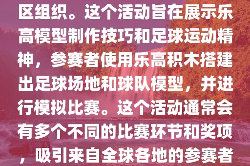 具体的活动安排和规则可能会因组织者和年份而异,建议关注相关社区或官方渠道以获取最新信息,乐高公司本身也可能推出与足球或世界杯相关的乐高套装或模型,供爱好者们收藏和展示。
