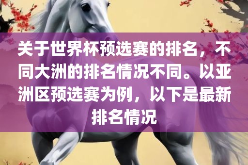 摘要:关于世界杯预选赛排名,各大洲情况各异。以亚洲区为例,最新的排名情况如下。随着比赛的进行,排名可能发生变化,请关注最新动态。