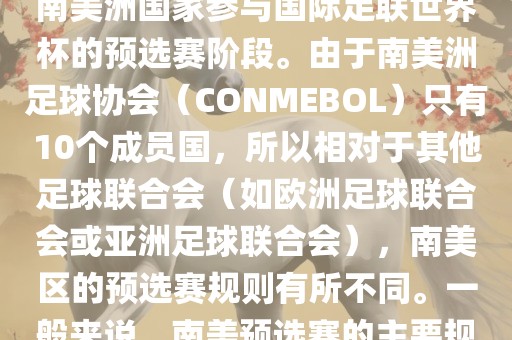 世界杯南美预选赛通常指的是南美洲国家参与国际足联世界杯的预选赛阶段。由于南美洲足球协会(CONMEBOL)只有10个成员国,所以相对于其他足球联合会(如欧洲足球联合会或亚洲足球联合会),南美区的预选赛规则有所不同。一般来说,南美预选赛的主要规则如下