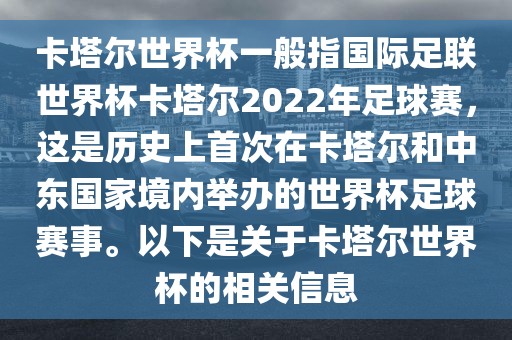 卡塔尔世界杯一般指国际足联世界杯卡塔尔2022年足球赛,这是历史上首次在卡塔尔和中东国家境内举办的世界杯足球赛事。以下是关于卡塔尔世界杯的相关信息