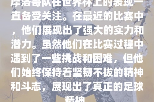 摩洛哥队在世界杯上的表现一直备受关注。在最近的比赛中,他们展现出了强大的实力和潜力。虽然他们在比赛过程中遇到了一些挑战和困难,但他们始终保持着坚韧不拔的精神和斗志,展现出了真正的足球精神。