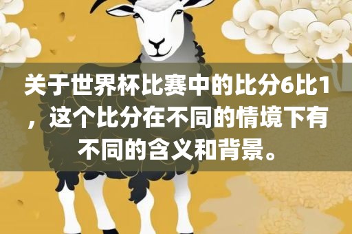 摘要:世界杯比赛中的比分6比1在不同情境下具有不同的含义和背景。这个比分可能代表着双方实力差距较大,也可能是比赛中的转折点,或者是某支队伍表现突出的体现。无论如何,比分都是比赛结果的一部分,反映了双方在比赛中的表现和实力对比。