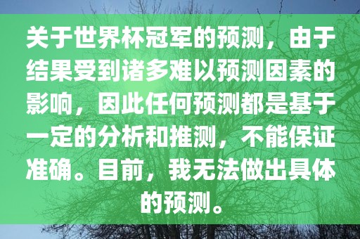 关于世界杯冠军的预测,由于结果受到诸多难以预测因素的影响,因此任何预测都是基于一定的分析和推测,不能保证准确。目前,我无法做出具体的预测。