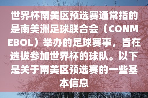 世界杯南美区预选赛通常指的是南美洲足球联合会(CONMEBOL)举办的足球赛事,旨在选拔参加世界杯的球队。以下是关于南美区预选赛的一些基本信息