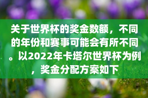 关于世界杯的奖金数额,不同的年份和赛事可能会有所不同。以2022年卡塔尔世界杯为例,奖金分配方案如下