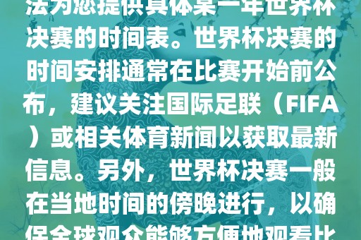 摘要:本文指出无法提供具体某一年世界杯决赛的时间表,建议读者关注国际足联或相关体育新闻以获取最新信息。世界杯决赛通常在当地时间的傍晚进行,以确保全球观众能够方便地观看比赛。具体决赛时间安排在比赛开始前公布。