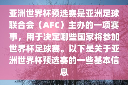 亚洲世界杯预选赛是亚洲足球联合会(AFC)主办的一项赛事,用于决定哪些国家将参加世界杯足球赛。以下是关于亚洲世界杯预选赛的一些基本信息
