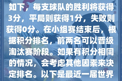 在世界杯小组赛中,积分规则简单明了,胜利得三分,平局得一分,失败为零分。小组赛结束后,根据积分排名,仅前两名可晋级淘汰赛阶段。若积分相同,则会考虑其他因素决定排名。最近一届世界杯小组赛积分竞争激烈,各队为晋级名额展开激烈争夺。