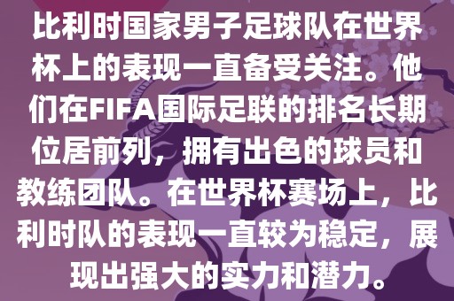 比利时国家男子足球队在世界杯上是一支备受关注的球队,他们拥有强大的实力和潜力,始终在比赛中展现出出色的表现,他们仍将是世界杯赛场上的重要竞争者之一。