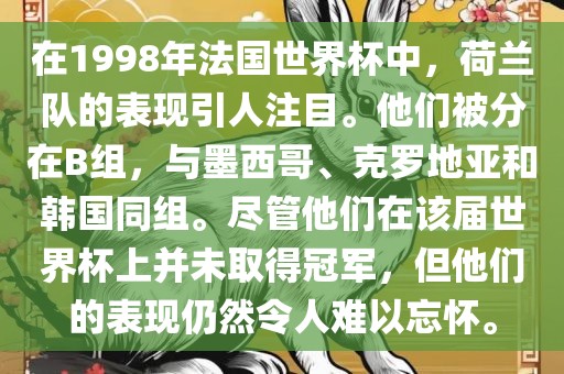 在1998年法国世界杯中,荷兰队的表现引人注目。他们被分在B组,与墨西哥、克罗地亚和韩国同组。尽管他们在该届世界杯上并未取得冠军,但他们的表现仍然令人难以忘怀。