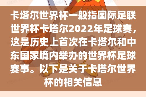 卡塔尔世界杯一般指国际足联世界杯卡塔尔2022年足球赛,这是历史上首次在卡塔尔和中东国家境内举办的世界杯足球赛事。以下是关于卡塔尔世界杯的相关信息