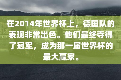 德国队在2014年世界杯上表现出色,最终夺得冠军,成为该届赛事的最大赢家。他们在比赛中的表现令人印象深刻,充分展现了实力和战术素养。这一成就让德国队在足球世界中再次崭露头角。