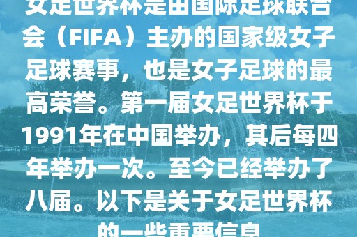 女足世界杯是由国际足球联合会(FIFA)主办的国家级女子足球赛事,也是女子足球的最高荣誉。第一届女足世界杯于1991年在中国举办,其后每四年举办一次。至今已经举办了八届。以下是关于女足世界杯的一些重要信息