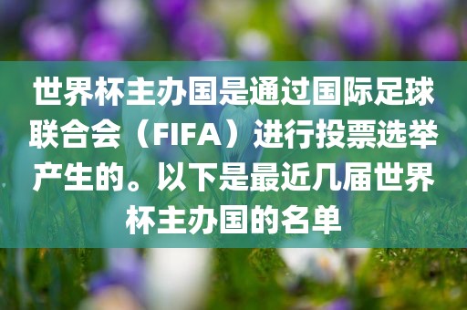 世界杯主办国是通过国际足球联合会(FIFA)进行投票选举产生的。以下是最近几届世界杯主办国的名单