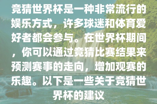 竞猜世界杯是一种非常流行的娱乐方式,许多球迷和体育爱好者都会参与。在世界杯期间,你可以通过竞猜比赛结果来预测赛事的走向,增加观赛的乐趣。以下是一些关于竞猜世界杯的建议