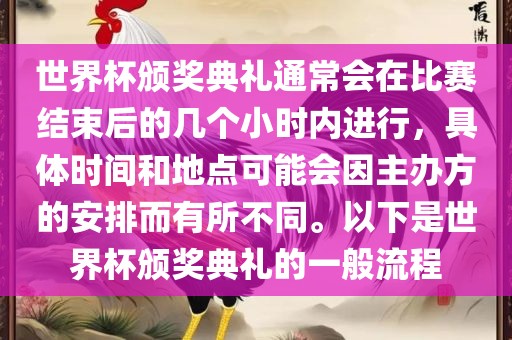 世界杯颁奖典礼通常会在比赛结束后的几个小时内进行,具体时间和地点可能会因主办方的安排而有所不同。以下是世界杯颁奖典礼的一般流程