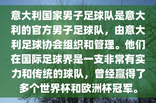 意大利国家男子足球队是意大利的官方男子足球队,由意大利足球协会组织和管理。他们在国际足球界是一支非常有实力和传统的球队,曾经赢得了多个世界杯和欧洲杯冠军。