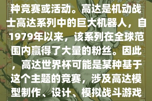 高达世界杯,通常指的是与高达这个知名动画系列相关的某种竞赛或活动。高达是机动战士高达系列中的巨大机器人,自1979年以来,该系列在全球范围内赢得了大量的粉丝。因此,高达世界杯可能是某种基于这个主题的竞赛,涉及高达模型制作、设计、模拟战斗游戏或与高达主题相关的其他活动。