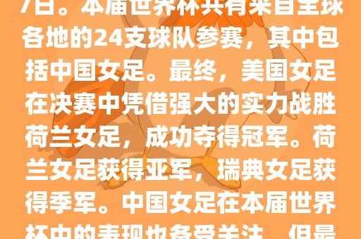 摘要:2019年女足世界杯在法国举行,是首次在欧洲举办的世界杯。比赛时间为一个月,共有来自全球各地的24支球队参赛,包括中国女足。美国女足夺冠,荷兰和瑞典分别获得亚军和季军。中国女足表现备受关注但未进八强。本届世界杯还创造了多项纪录和亮点。
