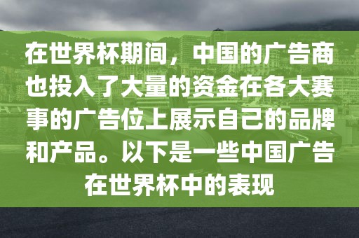 在世界杯期间,中国的广告商也投入了大量的资金在各大赛事的广告位上展示自己的品牌和产品。以下是一些中国广告在世界杯中的表现