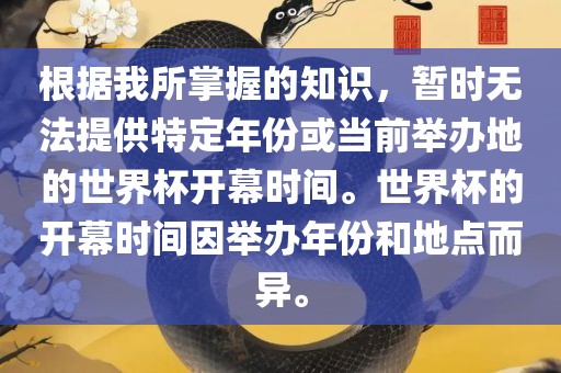 根据我所掌握的知识,暂时无法提供特定年份或当前举办地的世界杯开幕时间。世界杯的开幕时间因举办年份和地点而异。